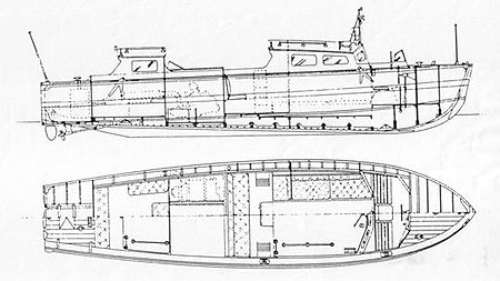 Now looking radically different from when she was in military service in the '80s a previous owner made major changes to the topsides, fitting a centrally located fully-enclosed cockpit and providing twin berths in each of two cabins with separate heads and kitchen facilities forward. In addition, over the years a lot of remedial repairs have also been made to the hull. Even so during his inspection Graham could see that it needed still more restoration since there were leaks around the chine lines and some of the front frames and ribs were in poor shape and needed replacing. In addition to changing out the rotten timber, since buying her in April 2004, Graham has raised the head height in the cabins (at 6' 3" tall he says he was fed up with banging his head) as well as re-skinning the hull entirely in 9mm marine ply and giving her a new coat of paint overall. As for future work he says he's got some work to do on a smoky P6 Perkins engine. "Could be the injectors or even the rings," he adds, though clearly, despite his early trepidation over timber craft he's very much been bitten by the bug.
