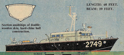 Key to numbered parts: (1) Towing eye. (2) Towing winch and emergency steering position. (3) Starboard engine exhaust. (4) Starboard propeller and rudder. There are three of each. (5) Starboard 500 h.p. Napier Sea Lion engines. There are three. (6) Vee drive to propeller shaft. The centre engine drives direct. (7) Engine room. (8) Rescue float. (9) Fresh-water float. (10) Forward engine-room hatch. (11) Engine-room ventilator. (12) Refuelling hatch. (13) Rescue net. (14) Fuel tanks; 2,250 gallons. (15) Rescue ladder. (16) Cabin air heater. (17) Companion way to below deck, with slides for stretchers. (18) Radio room. (19) Captain's cabin. (20) Officers' wash and toilet. (21) Sick bay with accommodation for five stretcher cases. (22) Galley. (23) Steering control drive. (24) Cot beds (stowed). (25) Crew's quarters. (26) Watertight door. (27) Anchor capstan. (28) Hatch. (29) Crew's wash and toilet. (30) Life-lines. (31) Helmsman in wheelhouse with compass and engine throttle controls. (32) Radar screen. (33) Navigating officer and chart table. (34) Navigating bridge with compass and searchlight. (35) Cage aerial. (36) Sense aerial. (37) Homing aerial. (38) Directional aerial. (39) Very high frequency aerial. (40) Radar scanner. (41) Movable loud-speaker. |