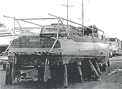Mr Morley appears to have involved the late Commander Peter Thornycroft, who was then connected with TT Boat Designs Ltd, Bembridge, TOW, in his plans for MTB 331's restoration as he arranged for the JONREY to be transported by road to Moody's yard and then towed over to Cowes where all equipment that had been added to her to make her more suitable as a motor cruiser was removed. In September 1981 MTB 331 was standing on chocks at Shepards Wharf East Cowes, her old superstructure had been removed and Harmo Thornycroft, Commander Thornycroft's son, had stripped many coats of paint off, down to the original hull planking.