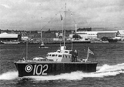 HSL 102 was one of the RAF 100 class High Speed Launches which joined the RAF fleet in 1937 to increase the operational range duties of the 200 class seaplane tenders. Built by The British Power Boat Company at Hythe, the 100 class HSLs were designed by Fred Cooper. The class were a stretched version of the 60ft MTB hull and the prototype was the format on which the RAF based their decision for a new type of high speed launch. The dimensions of the launch were 64ft loa with a beam of 14ft 6in, and powered by a trio of Power Napier Sea Lion engines. The range was 500 miles at a speed of 35 knots. The two wing engines were inclined to drive directly to the outboard propeller shafts whilst the centre engine faced the opposite direction and transmitted via a Vee-drive to the centre propeller. This arrangement allowed for "cruising" on the centre engine only, a range extending economy measure which retained a high degree of maneuverability.