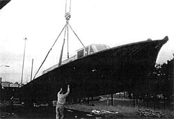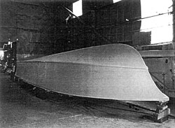 RSL 1502 was advertised for sale in the February 1956 edition of Motor Boat & Yachting and was subsequently sold. Thereafter she had several owners and was given the name of SINCLAIR. Her full movements are not known, however she was offered for sale again in April 1992, then lying in Brentford, Middlesex, where she remained until 1995 (see photo above), and was subsequently located at Acaster, near York in August 1997. The craft was donated to the BMPT by her then owner Dave Wright and was brought by low loader to Marchwood arriving at the site on 24.09.99.